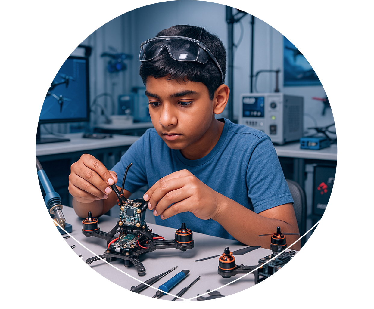 Our programs combine the flexibility of online learning with real-world hands-on practice. We ship robotics and drone kits to your home so you can build, program, and experiment while following live sessions, guided tutorials, and interactive challenges. Perfect for beginners to advanced learners who want to explore robotics, AI, and drone technologies in a practical way.